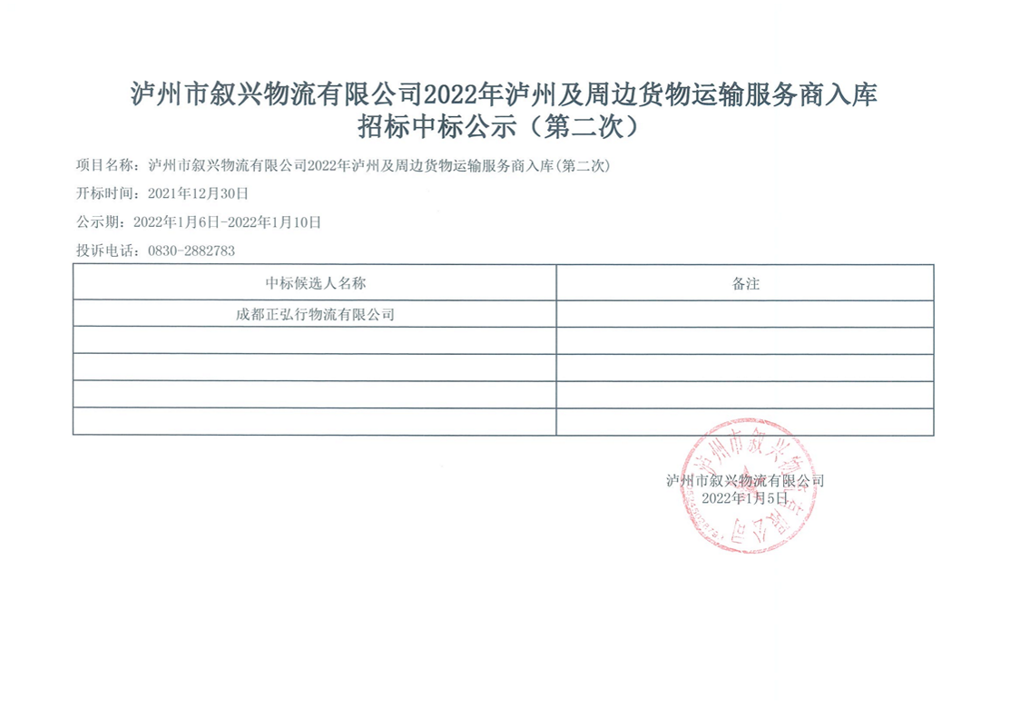 瀘州市敘興物流有限公司2022年度瀘州及周邊貨物運(yùn)輸服務(wù)商入庫(第二次)招標(biāo)中標(biāo)公示 作者: 來源: 日期:2022-01-05 瀏覽次數(shù): 次 【字體:小 大】 【打印正文】