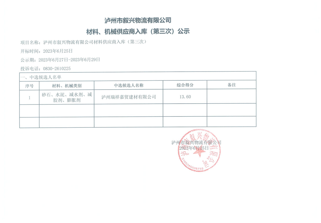 瀘州市敘興物流公司材料、機(jī)械供應(yīng)商入庫(kù)(第三次)公示