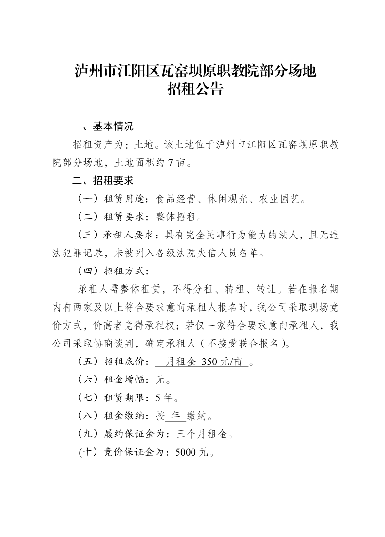 瀘州市江陽區(qū)瓦窯壩原職教院部分場(chǎng)地招租公告