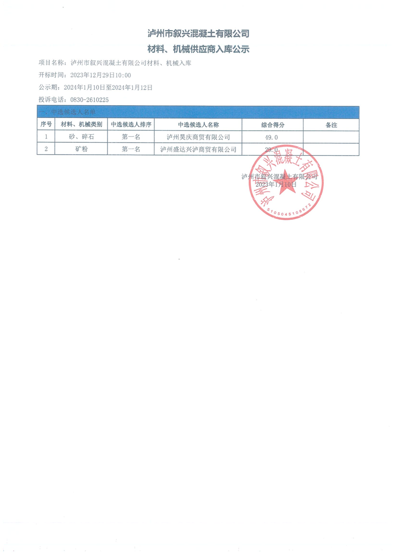 瀘州市敘興混凝土有限公司材料、機械供應(yīng)商入庫公示