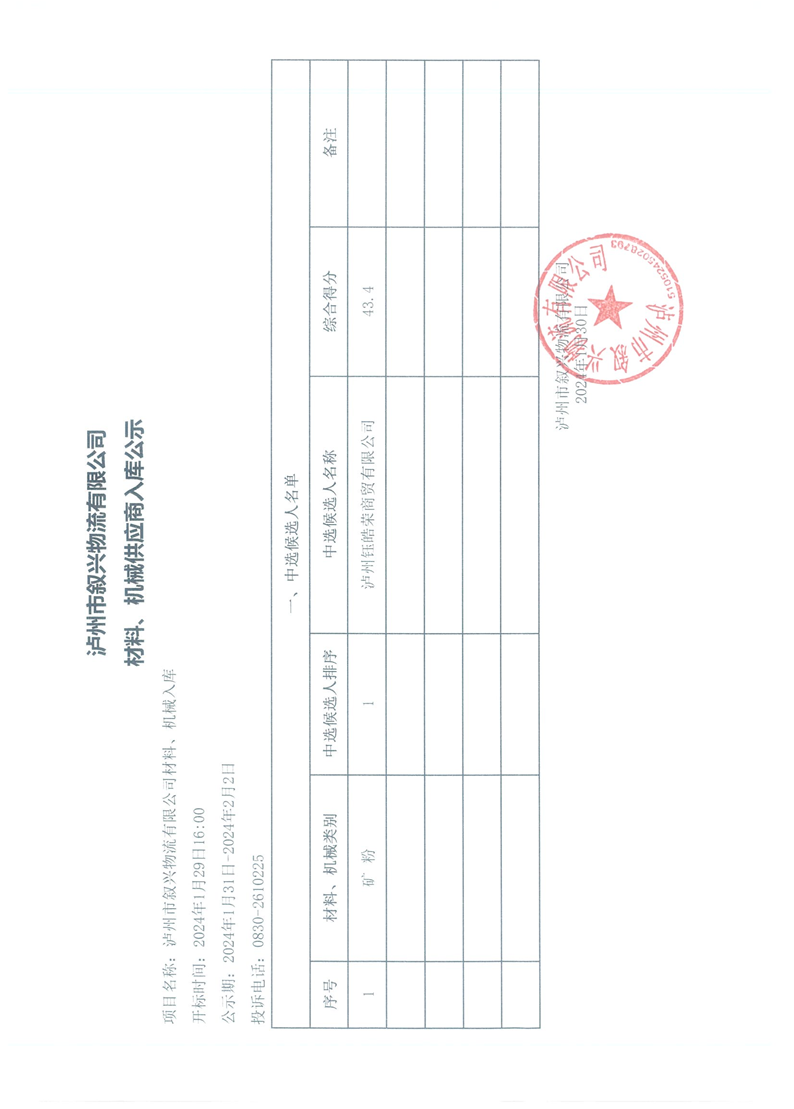 瀘州市敘興物流有限公司材料、機(jī)械供應(yīng)商入庫(kù)公示