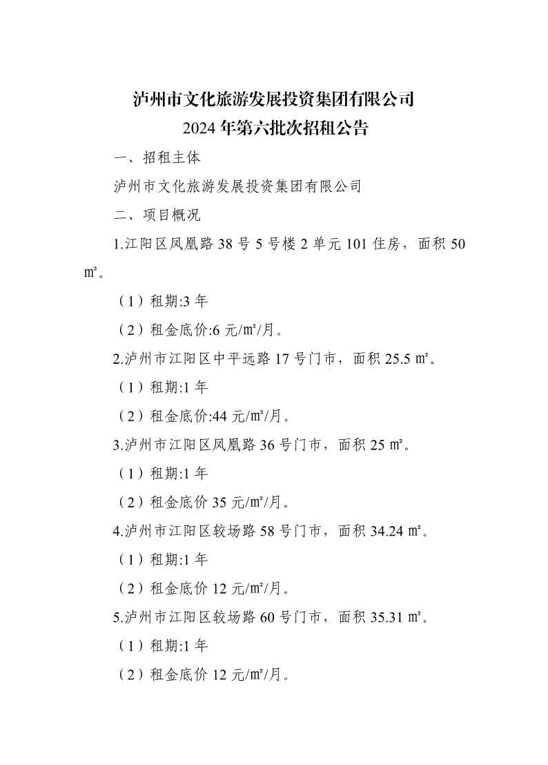 瀘州市文化旅游發(fā)展投資集團(tuán)有限公司2024年第六批次招租公告