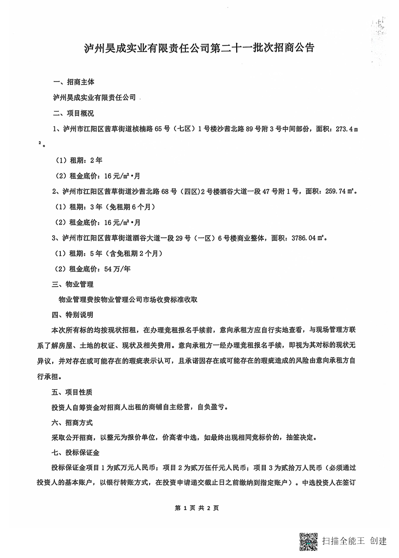 瀘州昊成實業(yè)有限責(zé)任公司第二十一批次招商公告