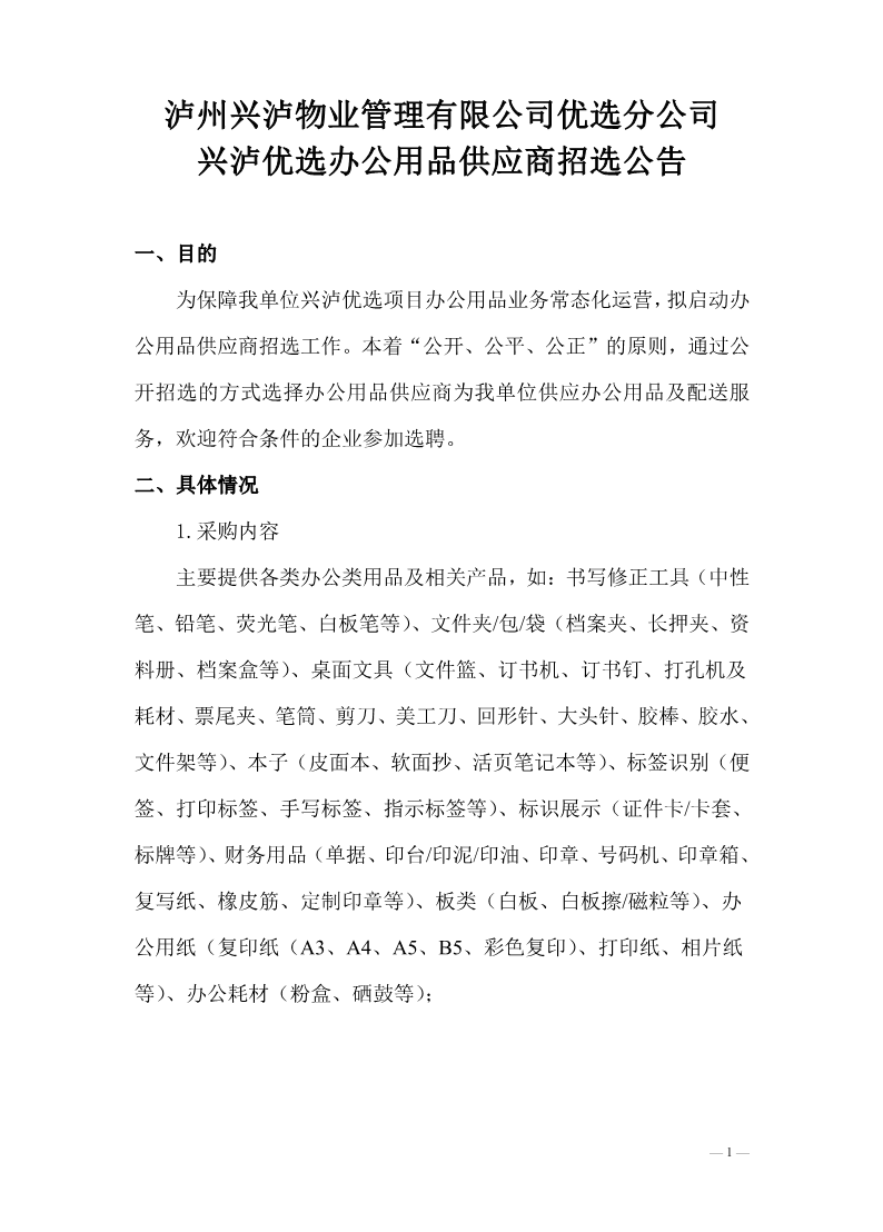 瀘州興瀘物業(yè)管理有限公司優(yōu)選分公司興瀘優(yōu)選辦公用品供應(yīng)商招選公告 作者: 來(lái)源: 日期:2024-09-20 瀏覽次數(shù): 次 【字體:小 大】 【打印正文】
