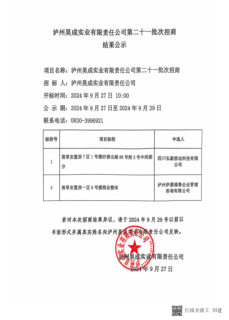 瀘州昊成實業(yè)有限責(zé)任公司第二十一批次招商結(jié)果公示