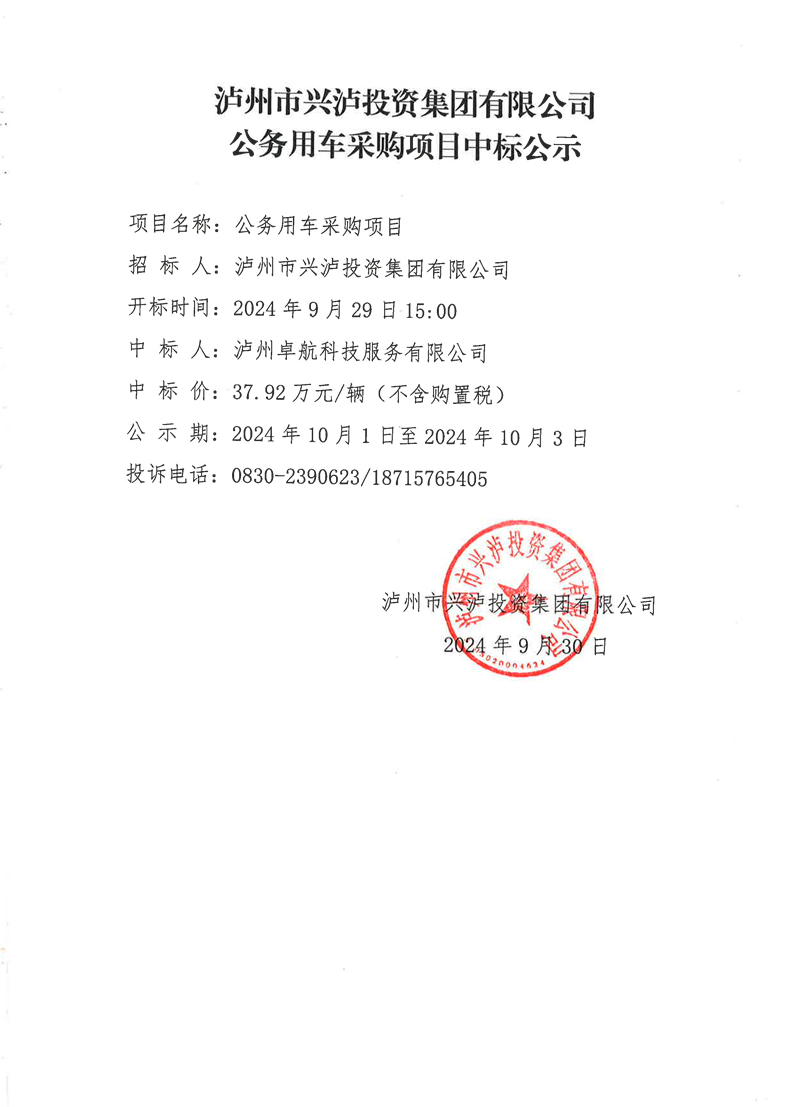 瀘州市興瀘投資集團(tuán)有限公司公務(wù)用車(chē)采購(gòu)項(xiàng)目中標(biāo)公示 作者: 來(lái)源: 日期:2024-09-30 瀏覽次數(shù): 次 【字體:小 大】 【打印正文】