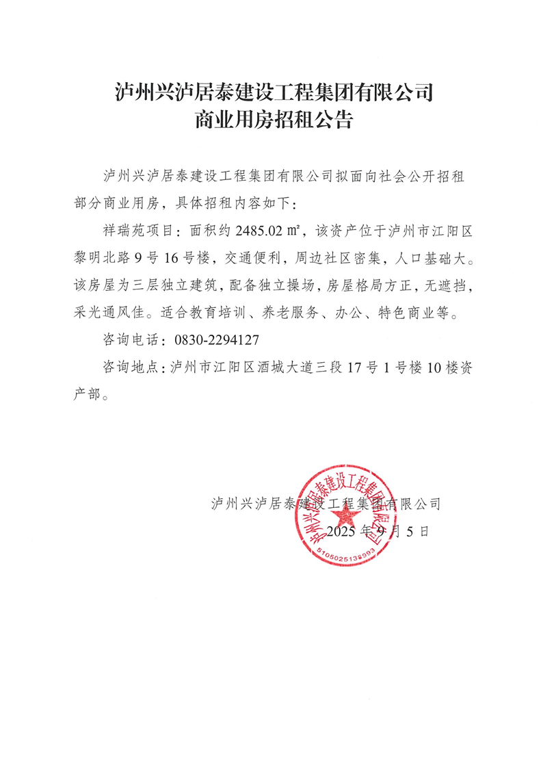 瀘州興瀘居泰建設工程集團有限公司商業(yè)用房招租公告