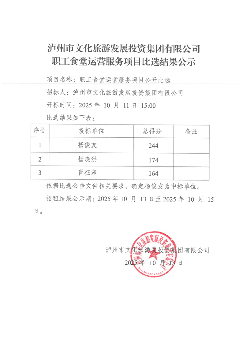 瀘州市文化旅游發(fā)展投資集團(tuán)有限公司職工食堂運(yùn)營(yíng)服務(wù)項(xiàng)目比選結(jié)果公示 作者: 來(lái)源: 日期:2025-10-13 瀏覽次數(shù): 次 【字體:小 大】 【打印正文】