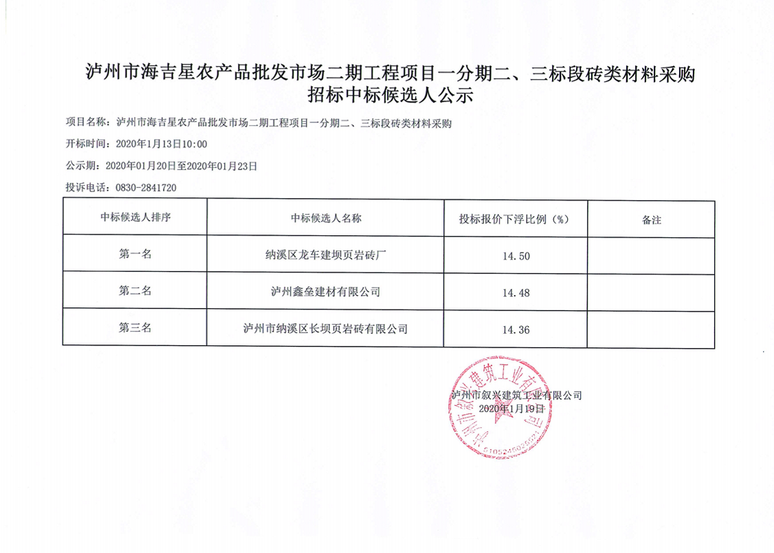 瀘州海吉星農(nóng)產(chǎn)品市場(chǎng)二期項(xiàng)目一分期二、三標(biāo)段磚類材料采購(gòu)招標(biāo)中標(biāo)候選人公示 作者: 來(lái)源: 日期:2020-01-19 瀏覽次數(shù): 次 【字體:小 大】 【打印正文】
