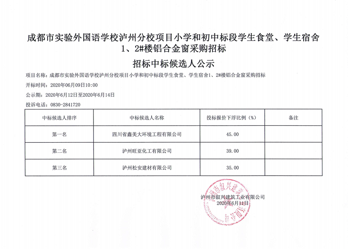 成都市實(shí)驗(yàn)外國(guó)語(yǔ)學(xué)校瀘州分校項(xiàng)目小學(xué)和初中標(biāo)段學(xué)生食堂、學(xué)生宿舍1、2#樓鋁合金窗采購(gòu)招標(biāo)中標(biāo)候選人公示