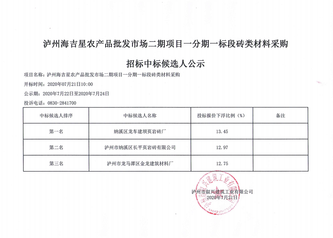 瀘州海吉星農(nóng)產(chǎn)品批發(fā)市場二期項目一分期一標(biāo)段磚類材料采購招標(biāo)中標(biāo)候選人公示 作者: 來源: 日期:2020-07-21 瀏覽次數(shù): 次 【字體:小 大】 【打印正文】