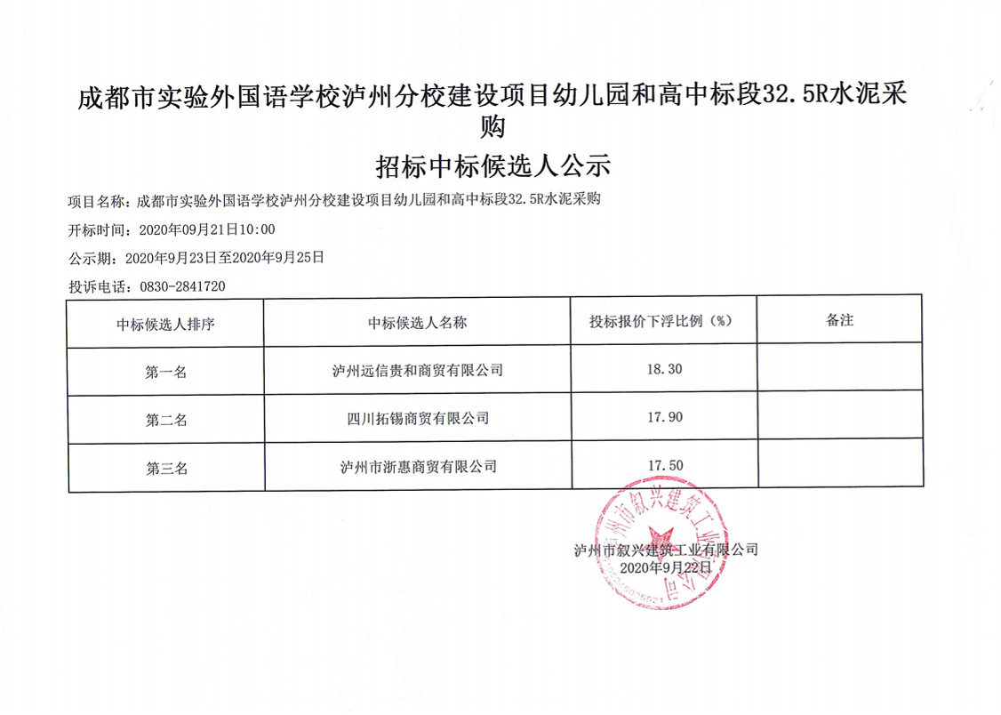成都市實(shí)驗(yàn)外國(guó)語(yǔ)學(xué)校瀘州分校項(xiàng)目幼兒園和高中標(biāo)段32.5R水泥采購(gòu)招標(biāo)中標(biāo)候選人公示 作者: 來源: 日期:2020-09-22 瀏覽次數(shù): 次 【字體:小 大】 【打印正文】