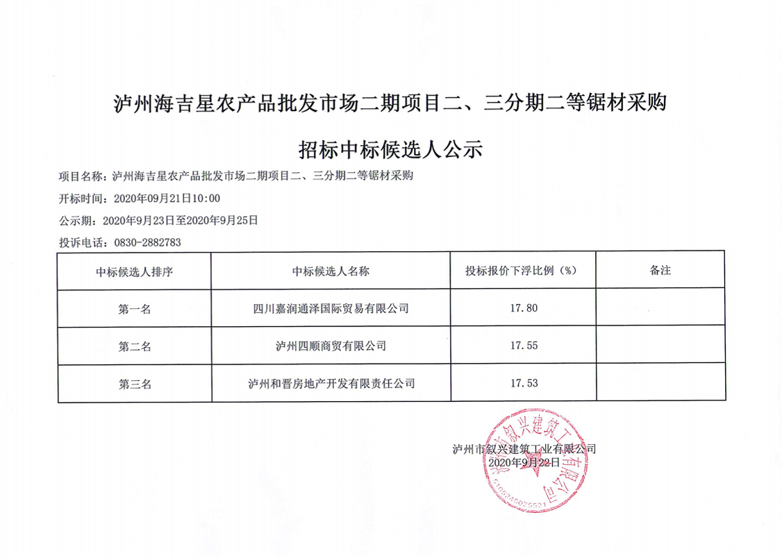瀘州海吉星農(nóng)產(chǎn)品批發(fā)市場二期項(xiàng)目二、三分期二等鋸材采購招標(biāo)中標(biāo)候選人公示 作者: 來源: 日期:2020-09-22 瀏覽次數(shù): 次 【字體:小 大】 【打印正文】