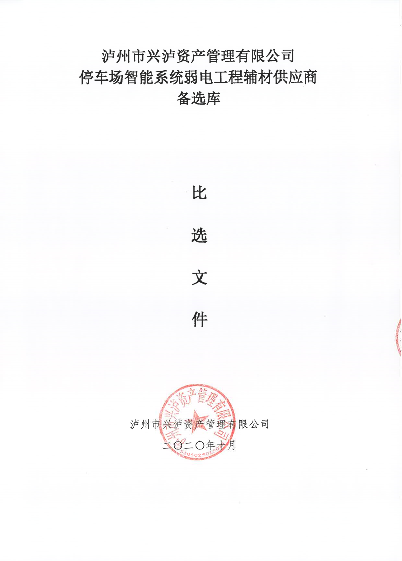 興瀘集團(tuán)旗下瀘州市興瀘資產(chǎn)管理有限公司停車場(chǎng)智能系統(tǒng)弱電工程輔材供應(yīng)商備選庫比選文件 作者: 來源: 日期:2020-10-22 瀏覽次數(shù): 次 【字體:小 大】 【打印正文】