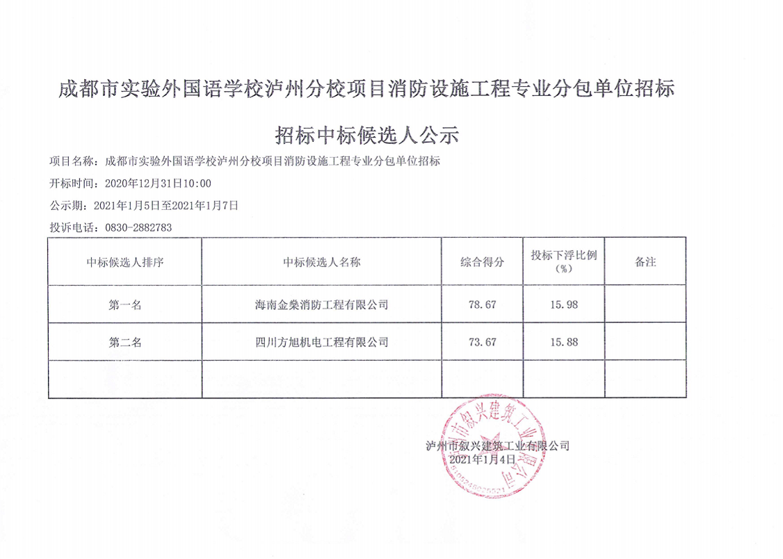 成都市實(shí)驗(yàn)外國(guó)語學(xué)校瀘州分校項(xiàng)目消防設(shè)施專業(yè)分包單位招標(biāo)中標(biāo)候選人公示 作者: 來源: 日期:2021-01-04 瀏覽次數(shù): 次 【字體:小 大】 【打印正文】