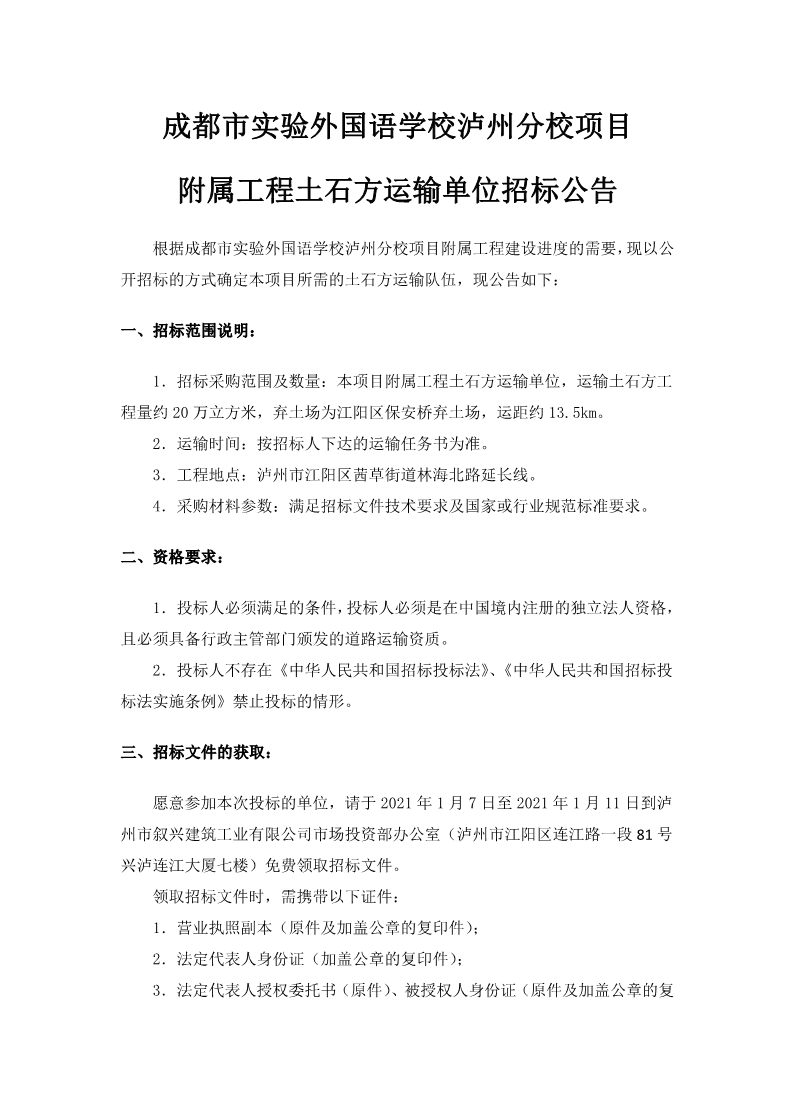 成都市實驗外國語學(xué)校瀘州分校項目附屬工程土石方運輸單位招標公告