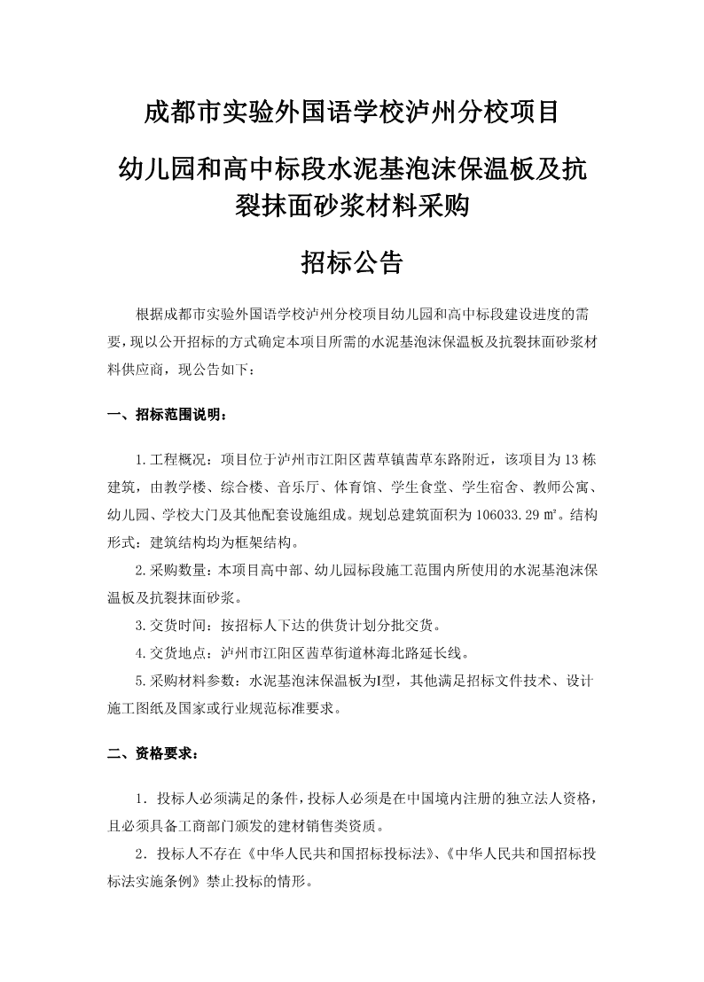 成都市實驗外國語學校瀘州分校項目幼兒園和高中標段水泥基泡沫保溫板及抗裂抹面砂漿材料采購招標公告