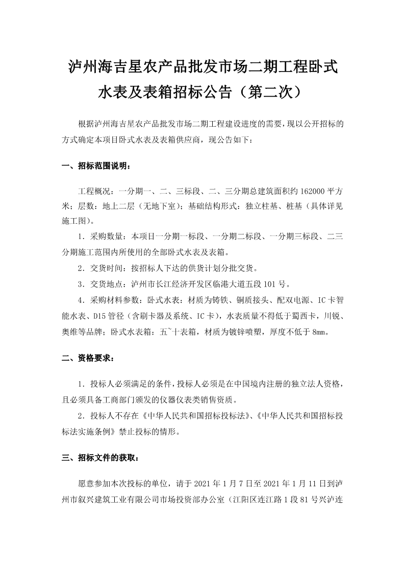 瀘州海吉星農(nóng)產(chǎn)品批發(fā)市場(chǎng)二期工程臥式水表及表箱招標(biāo)公告(第二次) 作者: 來(lái)源: 日期:2021-01-06 瀏覽次數(shù): 次 【字體:小 大】 【打印正文】