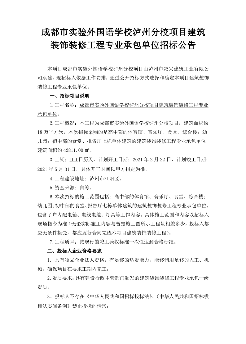 成都市實驗外國語學(xué)校瀘州分校項目建筑裝飾裝修工程專業(yè)承包單位招標(biāo)公告