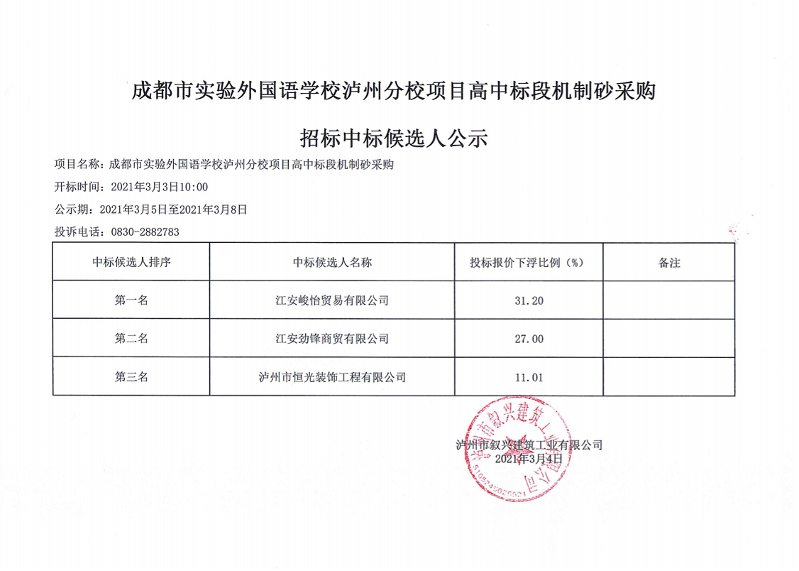 成都市實驗外國語學校瀘州分校項目高中標段機制砂采購招標中標候選人公示