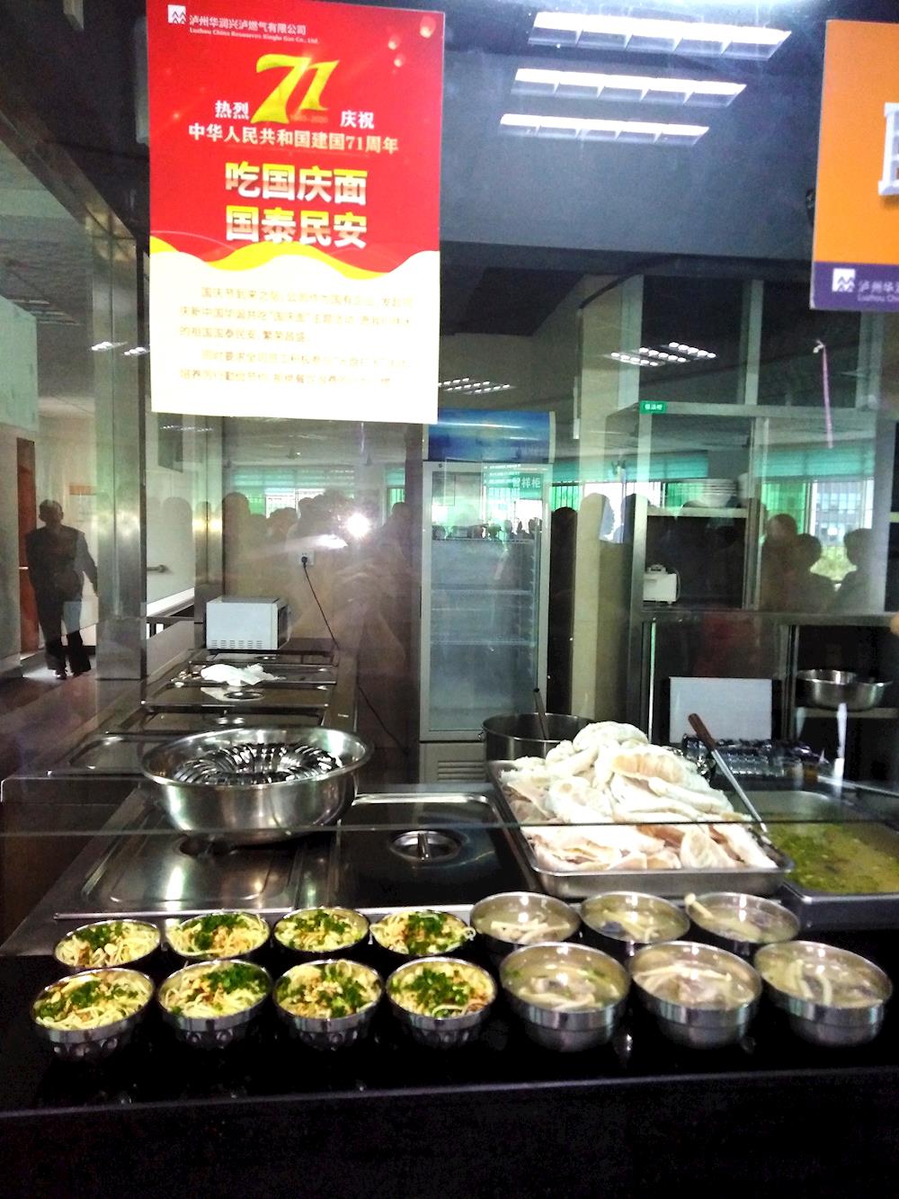 為慶祝中華人民共和國成立71周年,傳遞新時(shí)代愛國主義教育精神,9月28日中午,瀘州華潤興瀘燃?xì)庥邢薰驹趩T工食堂開展了別開生面的共吃“國慶面”主題活動(dòng)。